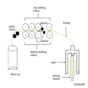 উত্তর: ফাইবারকে সমানভাবে সাজিয়ে ও হালকা পাক দিয়ে একটি ঝরঝরে রোভিং তৈরি করে, যা সুতা উৎপাদনে সহজতর করে তোলে।